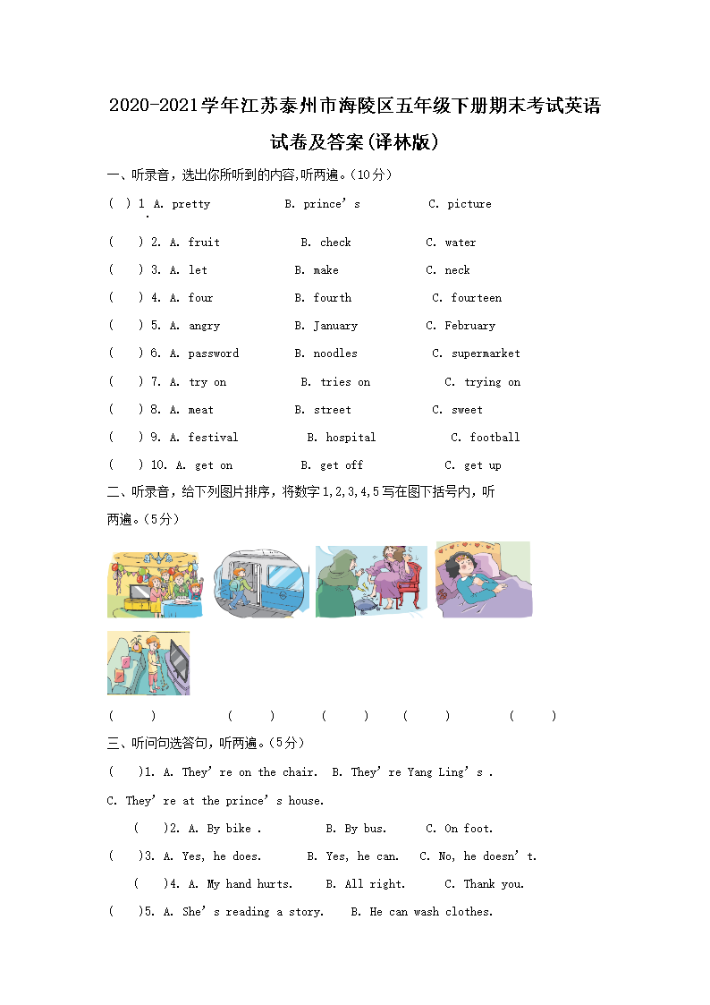 【文档预览】 文档大全网整理发布2020-2021学年江苏泰州市海陵区五年级下册期末考试英语试卷及答案(译林版)(Word版),前五页预览如下: