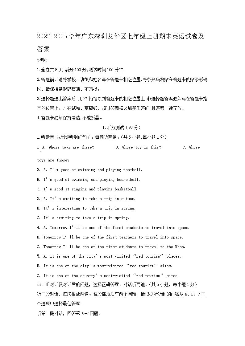 2022-2023学年广东深圳龙华区七年级上册期末英语试卷及答案(Word版)09-26