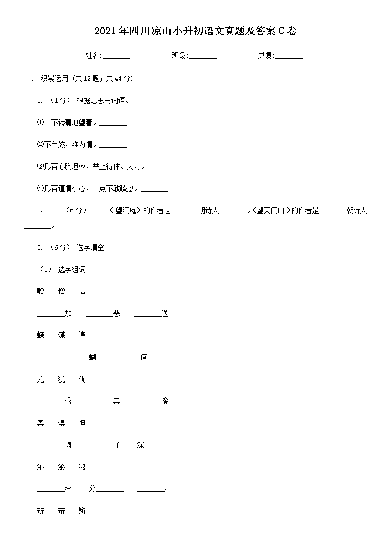 2021年四川凉山小升初语文真题及答案C卷(Word版)09-29