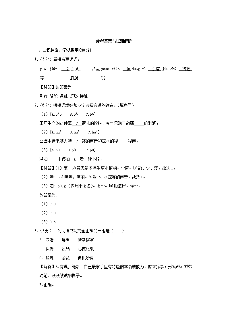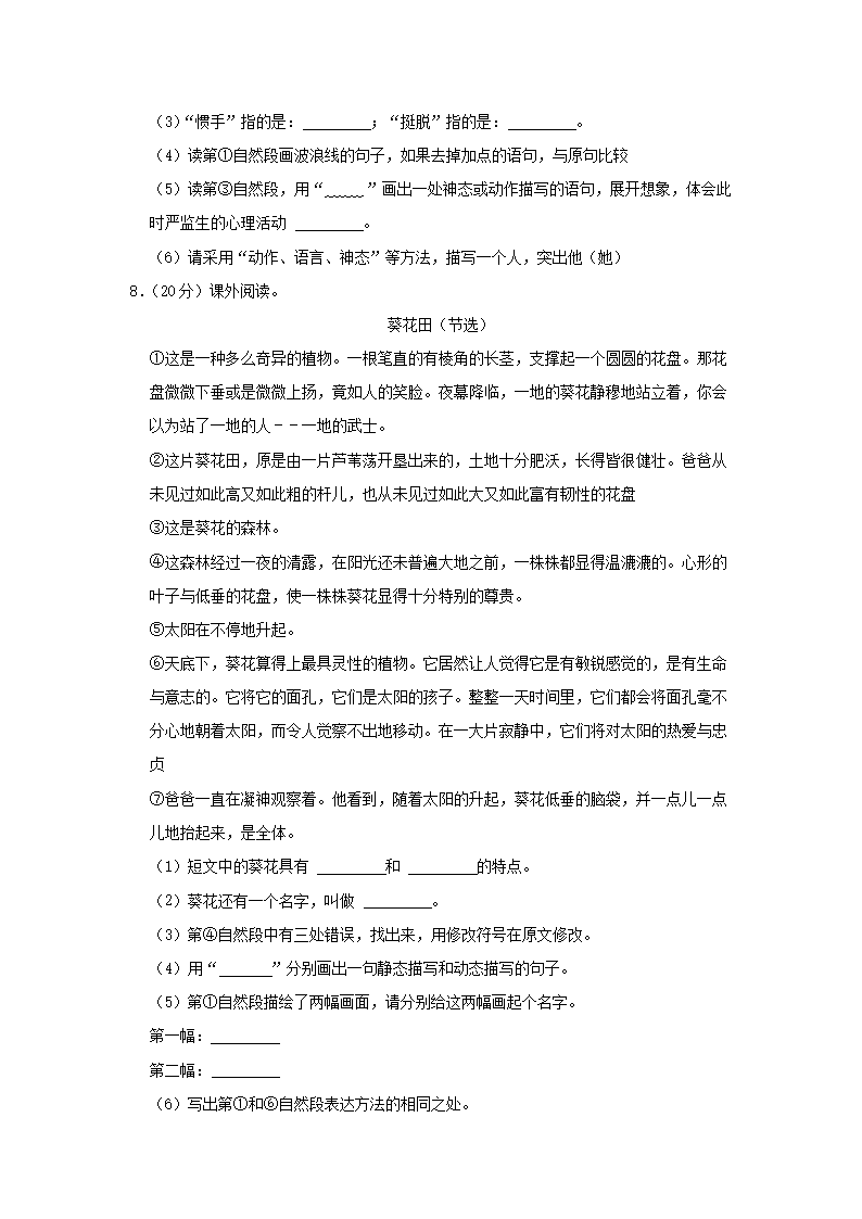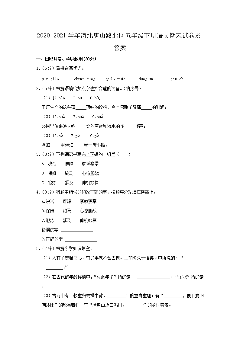 2020-2021学年河北唐山路北区五年级下册语文期末试卷及答案(Word版)06-29