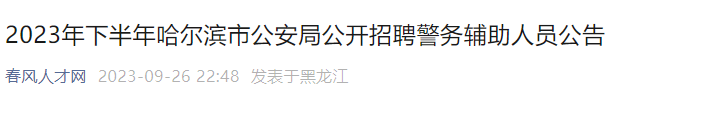 【#招警考试# #2023下半年黑龙江哈尔滨市公安局招聘警务辅助人员62名公告(10月12日-16日)#】®文档大全网从春风人才网获悉,2023下半年黑龙江哈尔滨市公安局招聘警务辅助人员62名。报名时间:10月12日-16日,更多事宜请参考阅读《招聘公告》,官方公告原文如下: