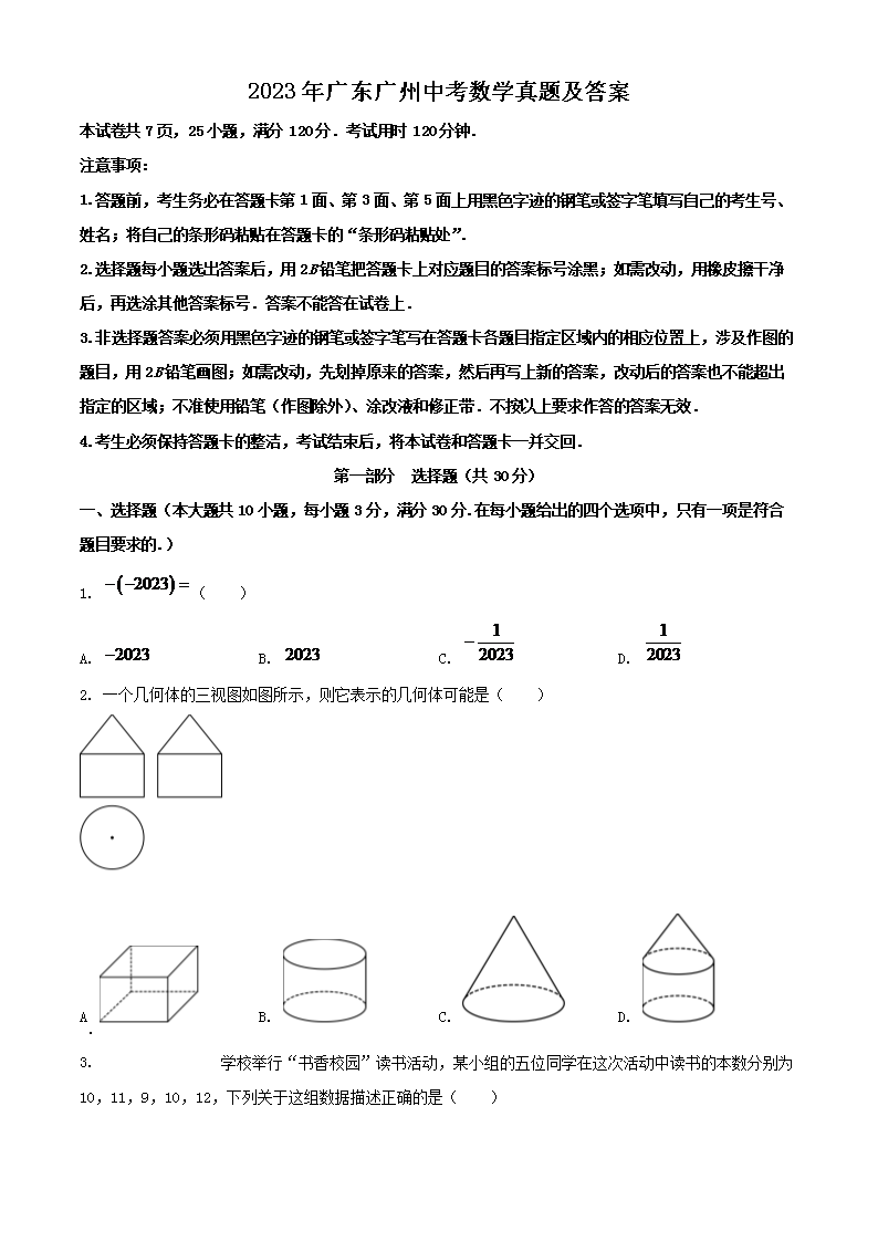 2023年广东广州中考数学真题及答案(Word版)09-23