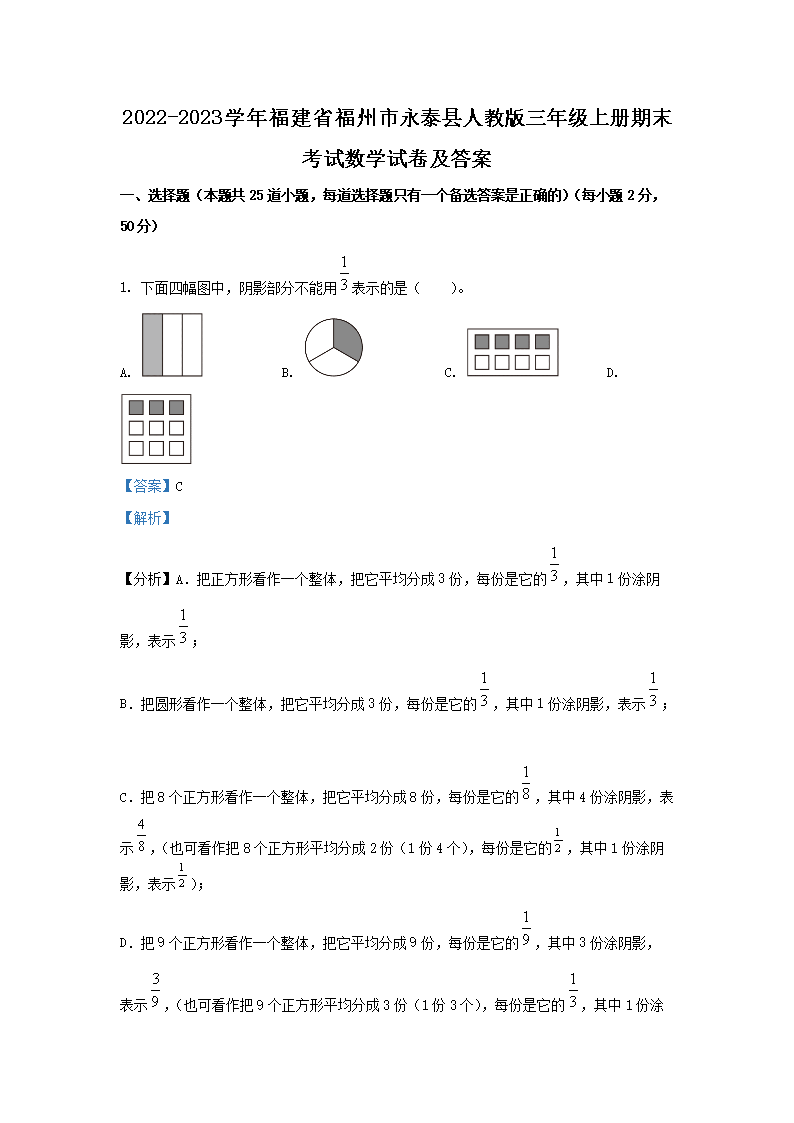 2022-2023学年福建省福州市永泰县人教版三年级上册期末考试数学试卷及答案(Word版)09-15