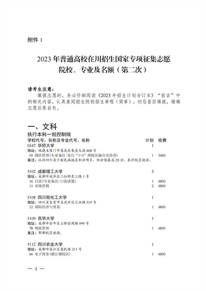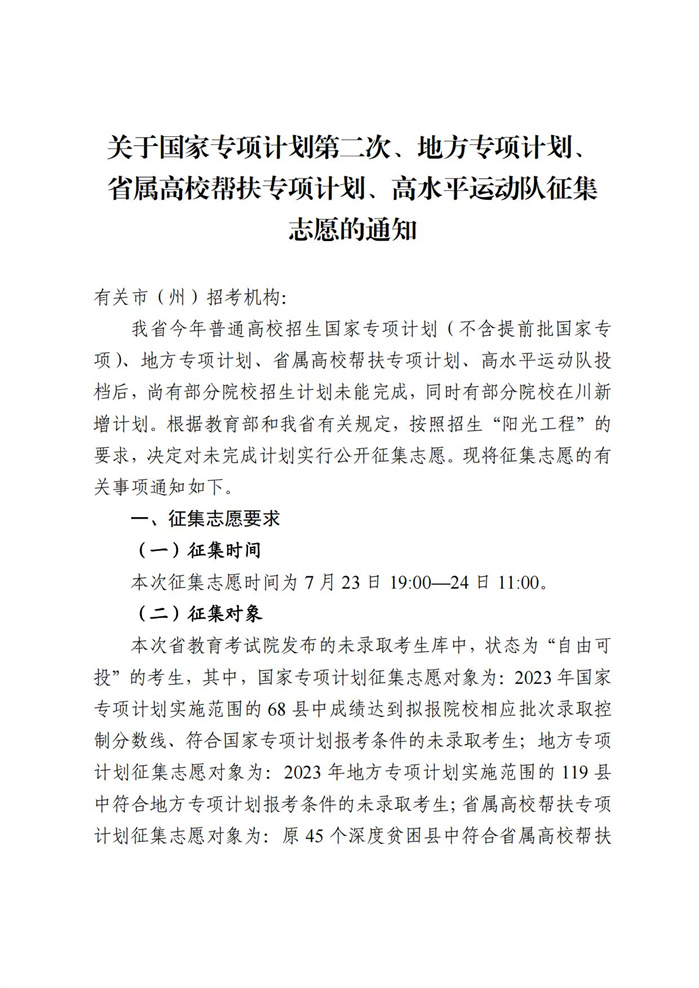 【#高考# 导语】®文档大全网高考频道从四川省教育考试院了解到,2023年四川高考国家专项第二次、地方专项、省属高校帮扶专项、高水平运动队征集志愿的通知已公布,具体如下: