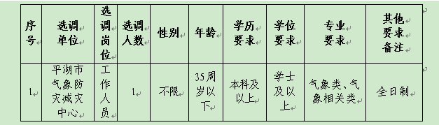 平湖市气象防灾减灾中心位于浙江省嘉兴市平湖市行政中心2号楼,为公益一类事业单位。现因工作需要,决定面向浙江省和上海市公开选调事业单位工作人员1名。现将有关事项公告如下: