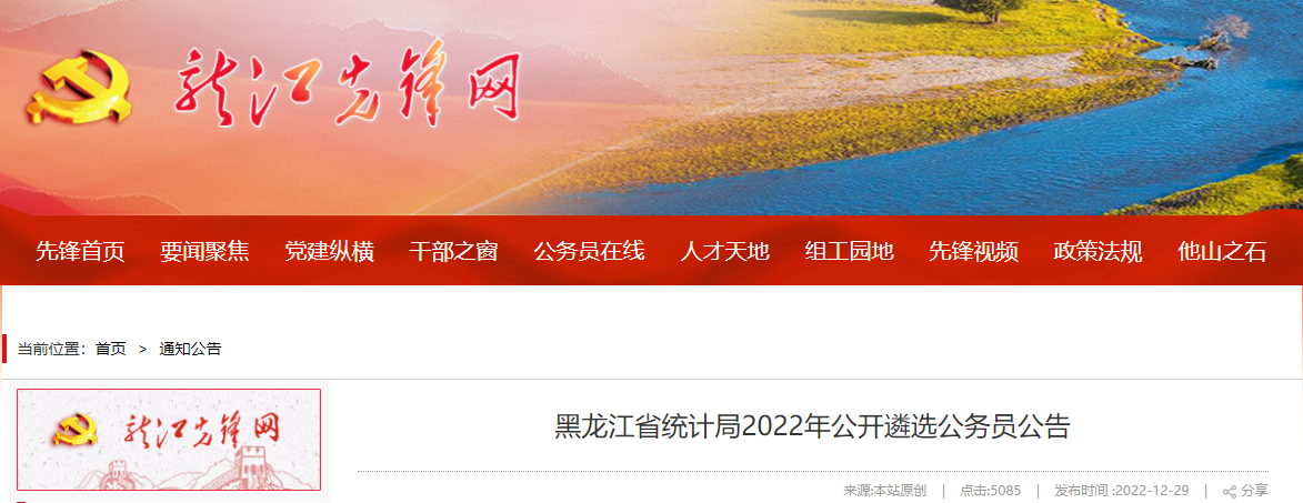 【#遴选# 导语】©文档大全网从龙江先锋网了解到,2022年黑龙江省统计局遴选公务员7人,报名时间:1月3日-9日,相关事宜如下: