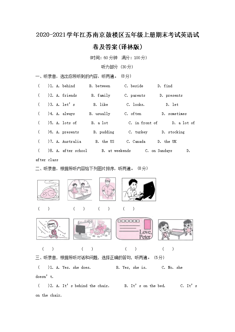 【文档预览】 文档大全网整理发布2020-2021学年江苏南京鼓楼区五年级上册期末考试英语试卷及答案(译林版)(Word版),前五页预览如下: