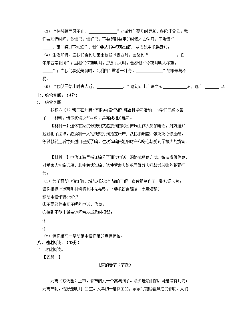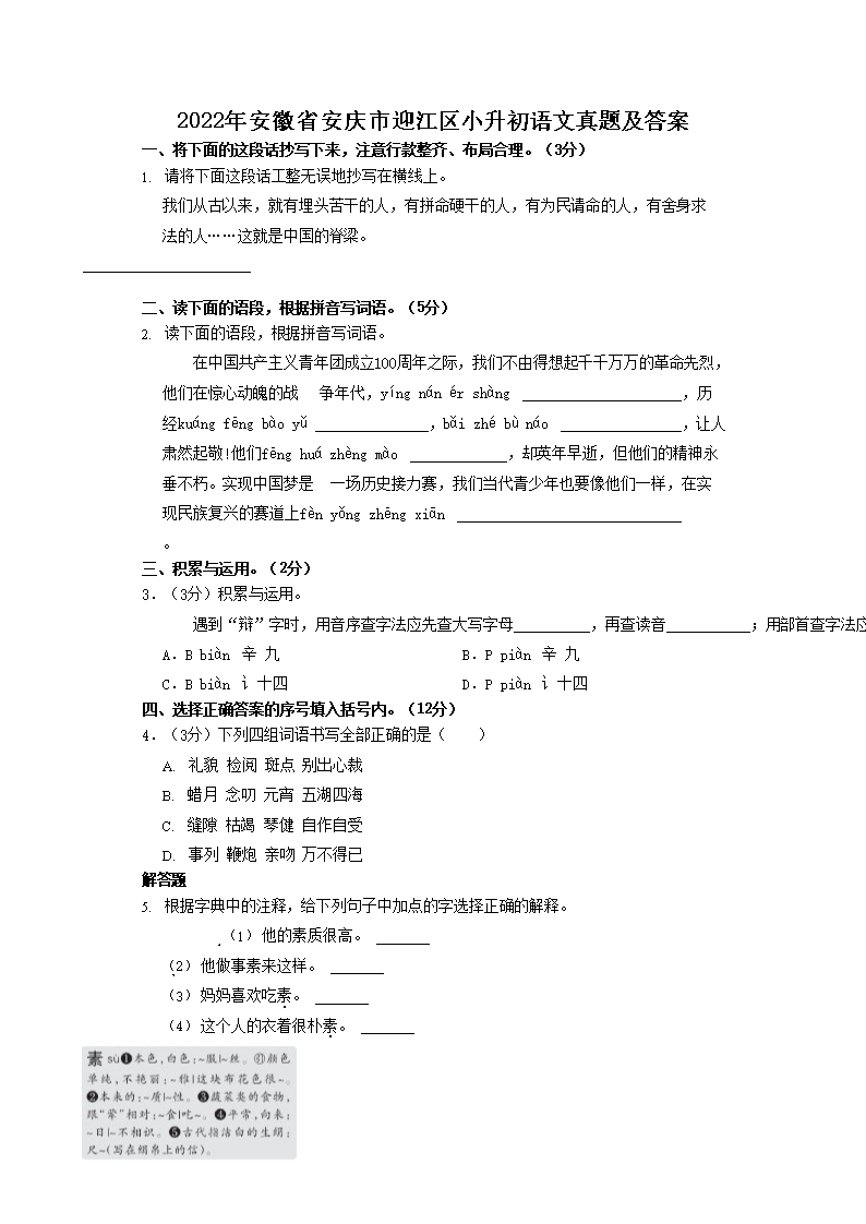 【文档预览】 文档大全网整理发布2022年安徽省安庆市迎江区小升初语文真题及答案(Word版),前五页预览如下: