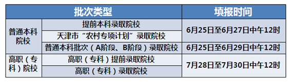 第一次填报是6月25日至6月29日12时,考生填报普通本科批次及以上批次高校志愿。其中,27日12时前,考生填报艺术类及体育类本科批次、提前本科批次志愿、天津市“农村专项计划”批次志愿;29日12时前,考生填报普通本科批次志愿,含A、B两个阶段。