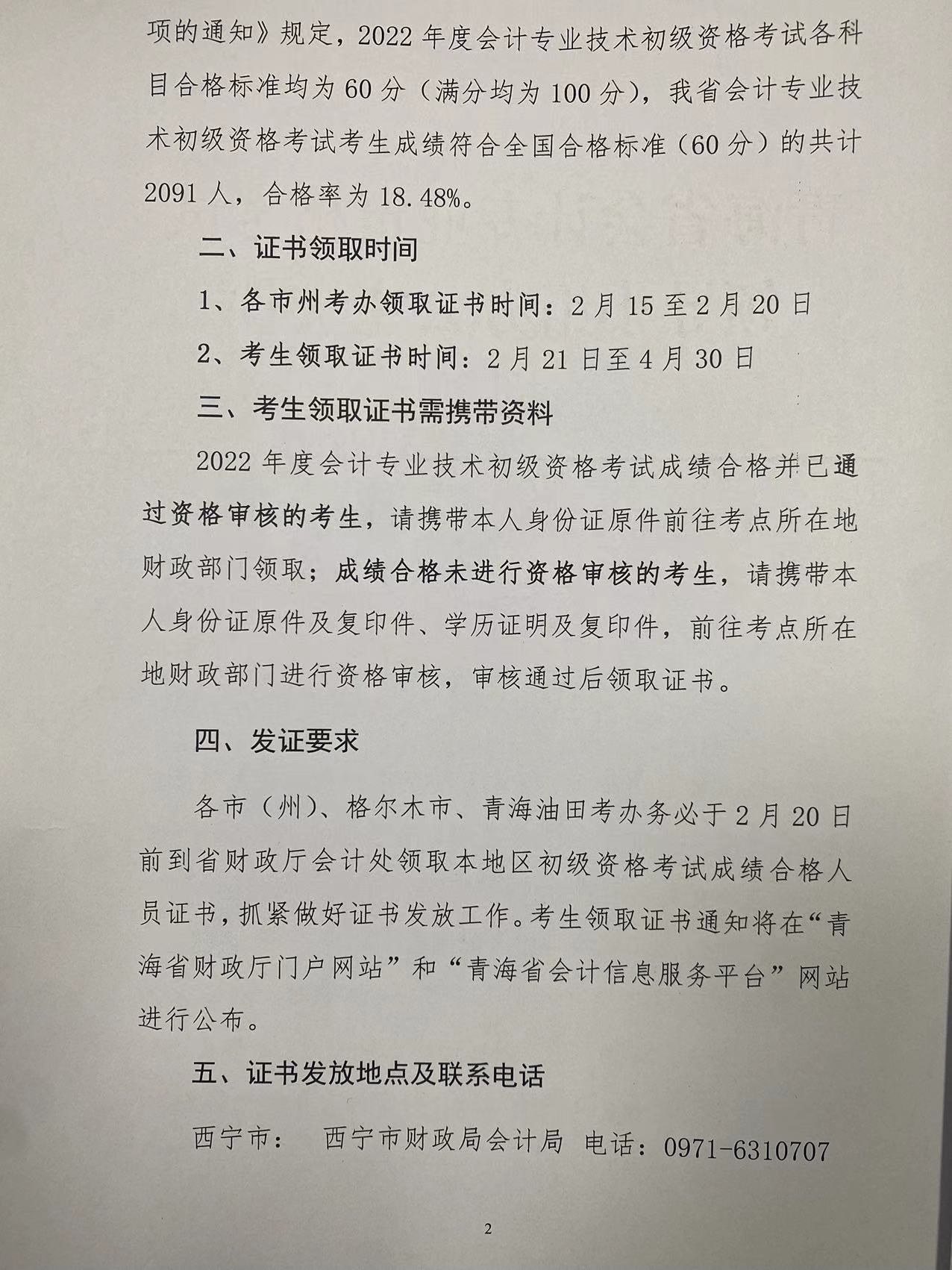 2022年青海初级会计职称证书领取时间:2023年2月21日-4月30日02-17