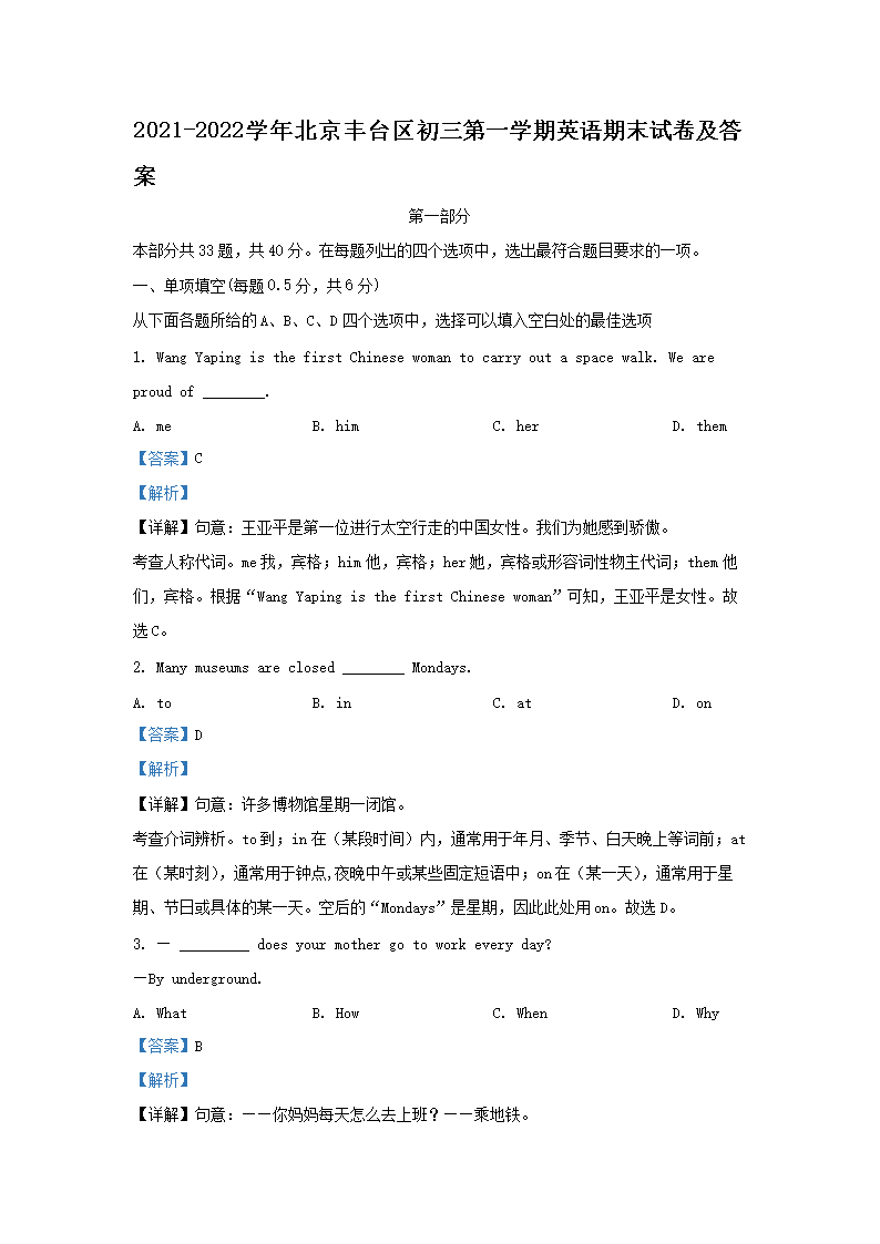 2021-2022学年北京丰台区初三第一学期英语期末试卷及答案(Word版)08-15