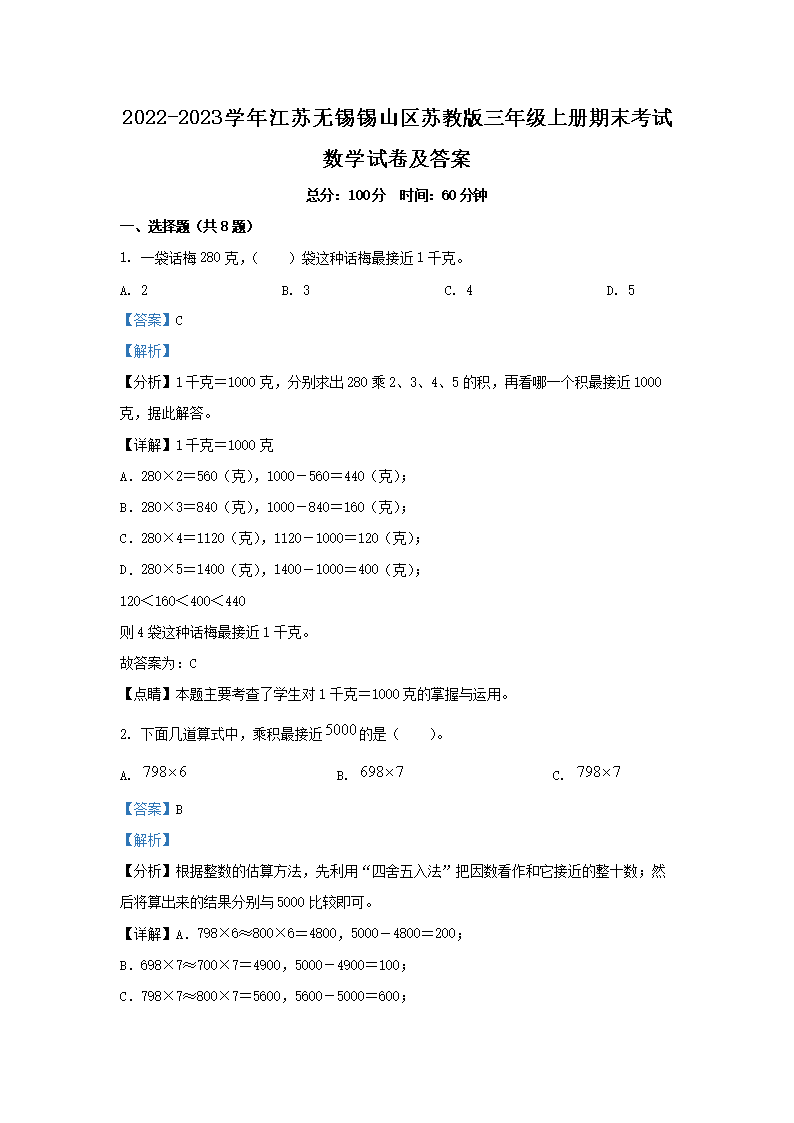 2022-2023学年江苏无锡锡山区苏教版三年级上册期末考试数学试卷及答案(Word版)07-14