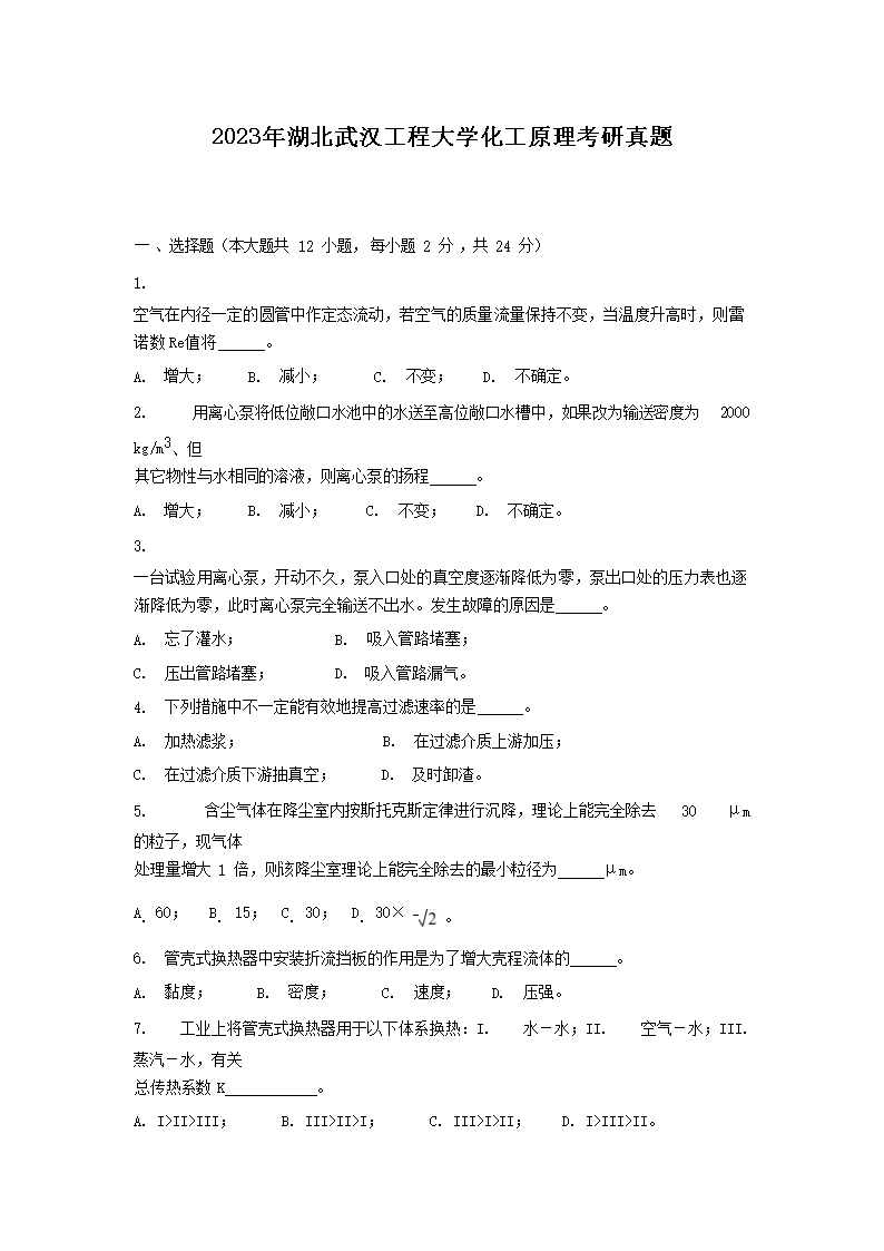 【文档预览】 文档大全网整理发布2023年湖北武汉工程大学化工原理考研真题(Word版),前五页预览如下:
