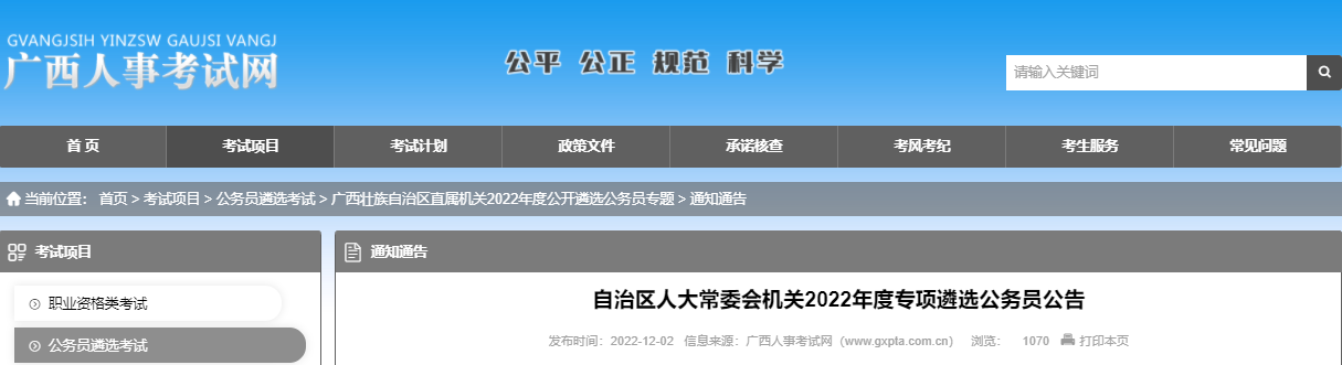 2022年广西自治区人大常委会机关专项遴选公务员公告(报名时间12月3日-8日)12-06