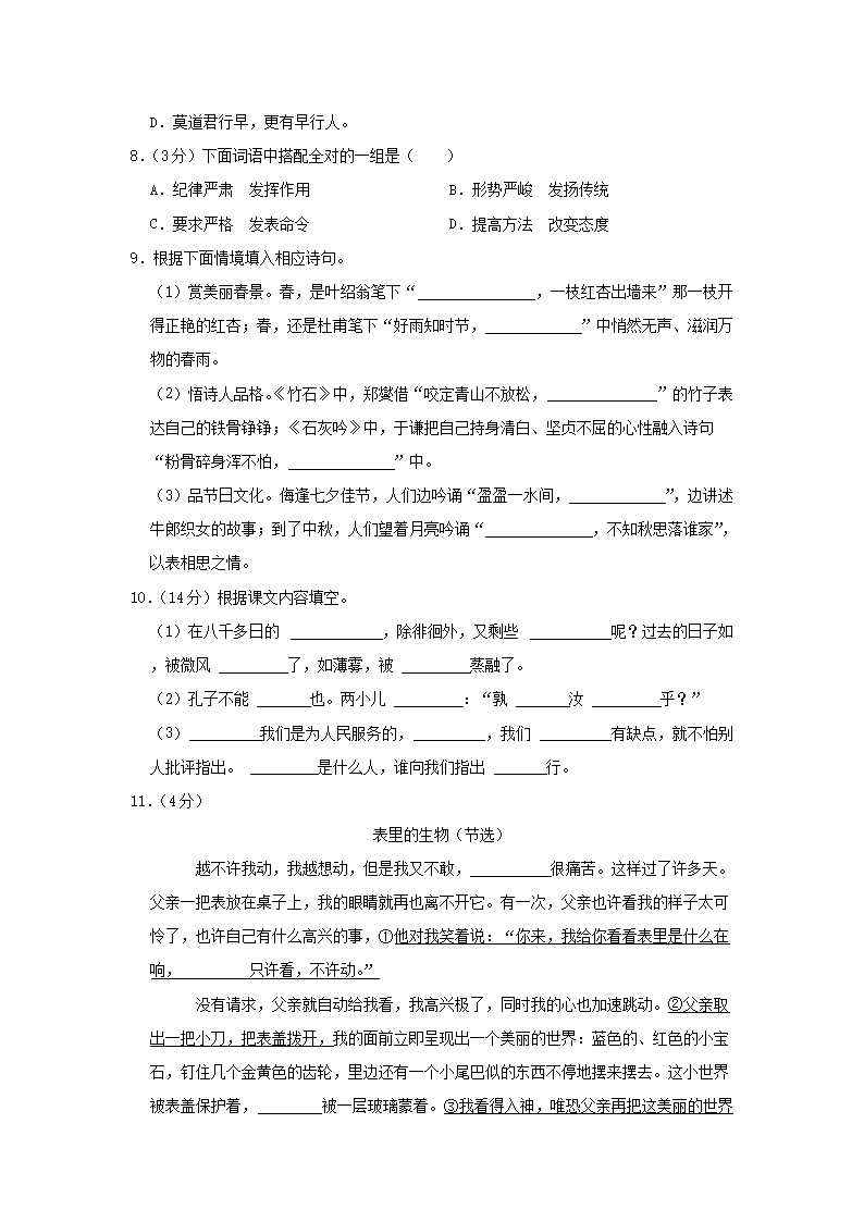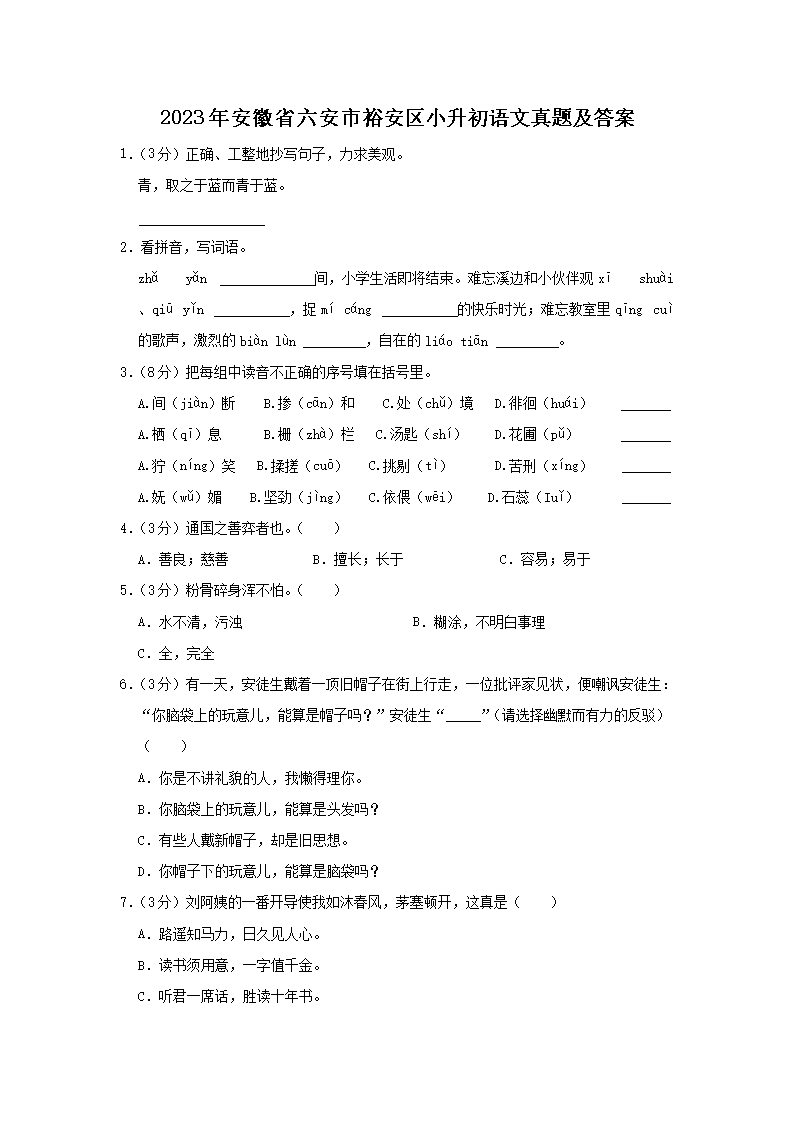 2023年安徽省六安市裕安区小升初语文真题及答案(Word版)09-22