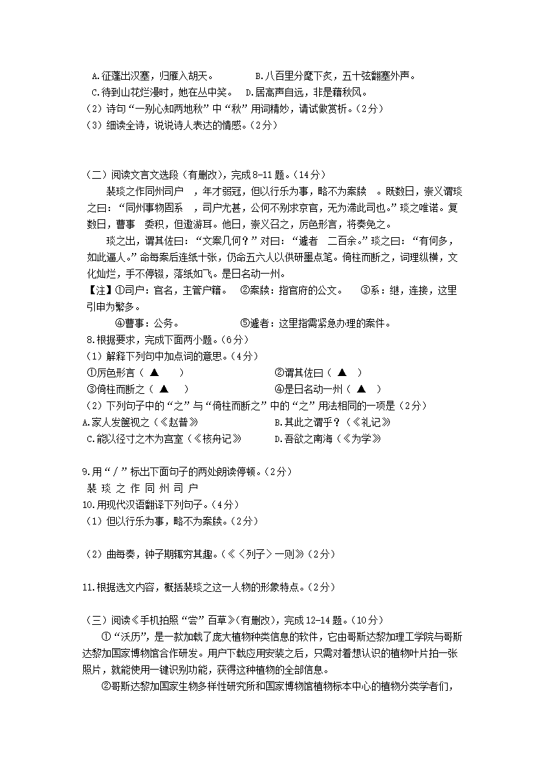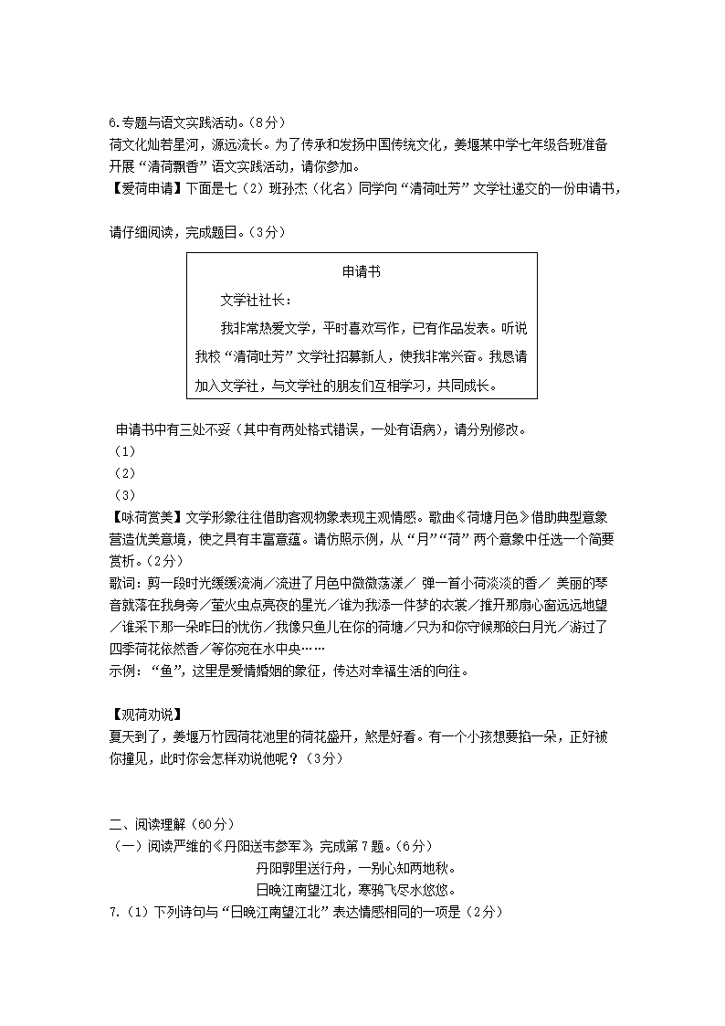 2016-2017学年江苏泰州市姜堰区七年级下册期末语文试卷及答案(Word版)06-07