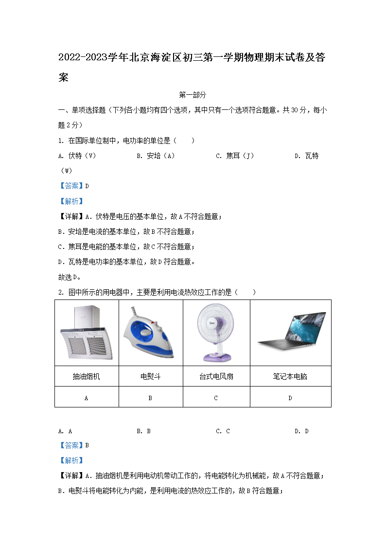 2022-2023学年北京海淀区初三第一学期物理期末试卷及答案(Word版)08-05