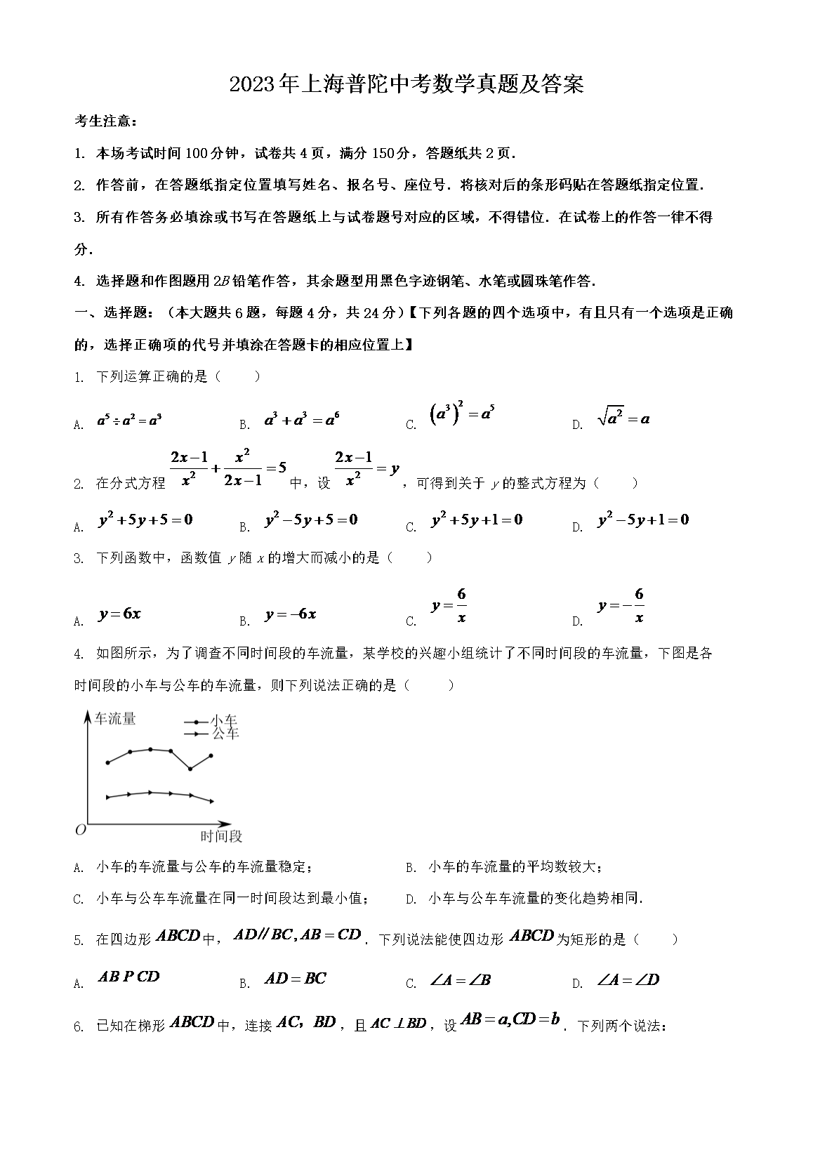 2023年上海普陀中考数学真题及答案(Word版)06-22