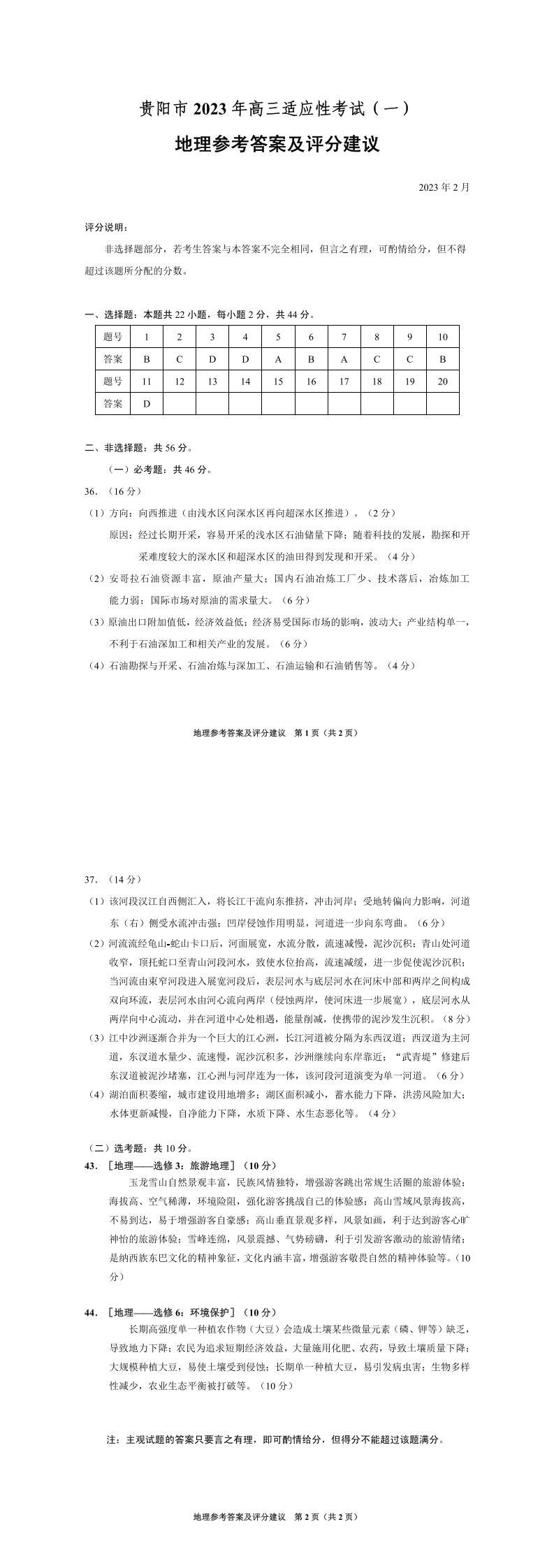 2023年贵州省贵阳市高三适应性考试(一)地理参考答案及评分建议02-18