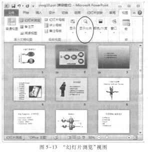①单击“视图”选项卡“演示文稿视图”组的“幻灯片浏览”命令,或单击窗口底部“幻灯片浏览”视图按钮,进入“幻灯片浏览”视图,如图5—13左侧所示。