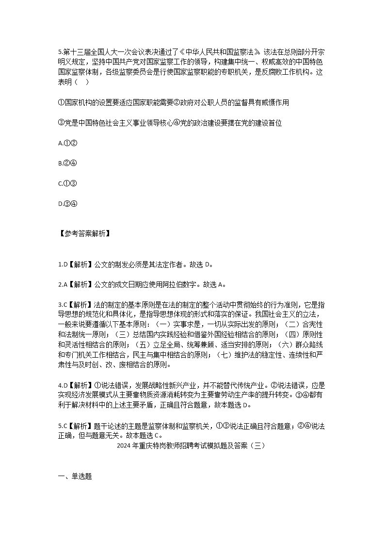 2024年重庆特岗教师招聘考试模拟题及答案(Word版)10-20