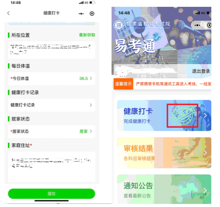 一、请考生自11月16日起,按要求登录“甘肃教育考试易考通”微信小程序进行健康打卡,每位考生需完成8次打卡。