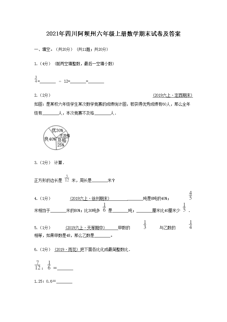 2021年四川阿坝州六年级上册数学期末试卷及答案(Word版)07-31