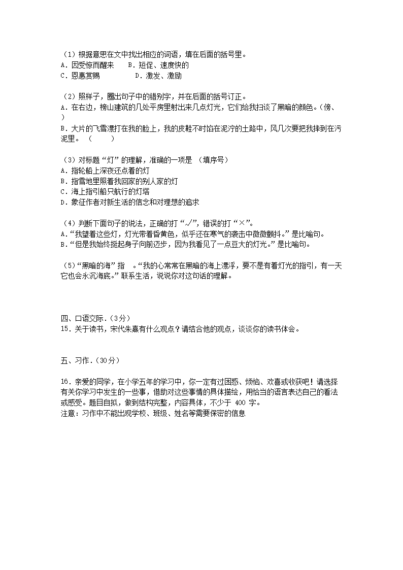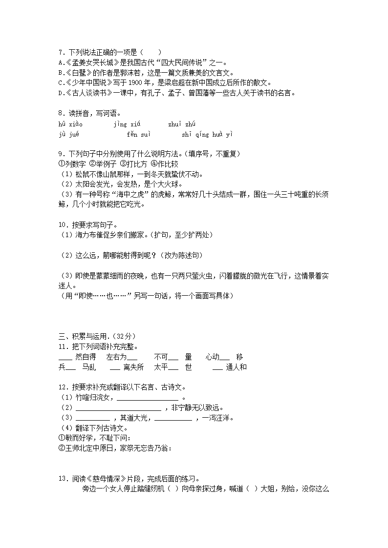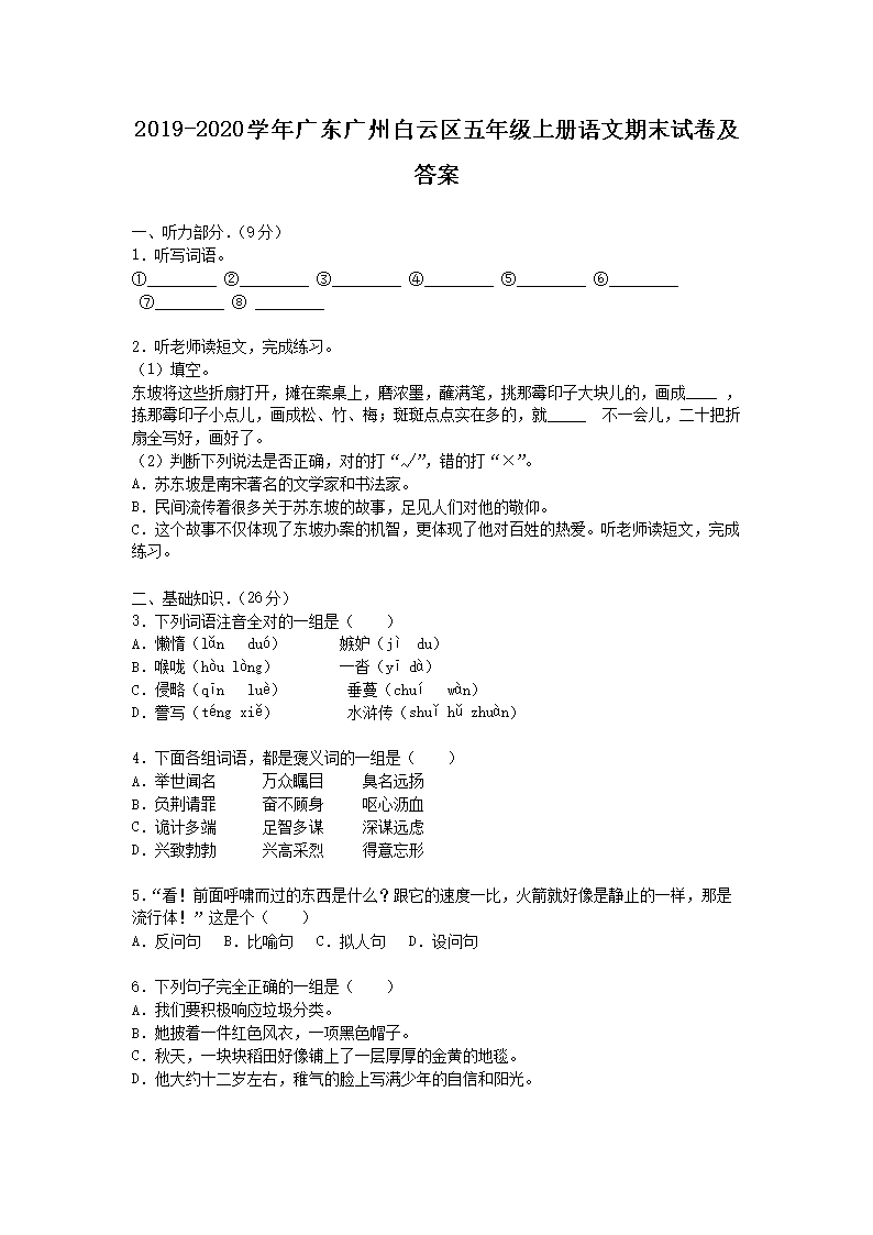 2019-2020学年广东广州白云区五年级上册语文期末试卷及答案(Word版)08-01