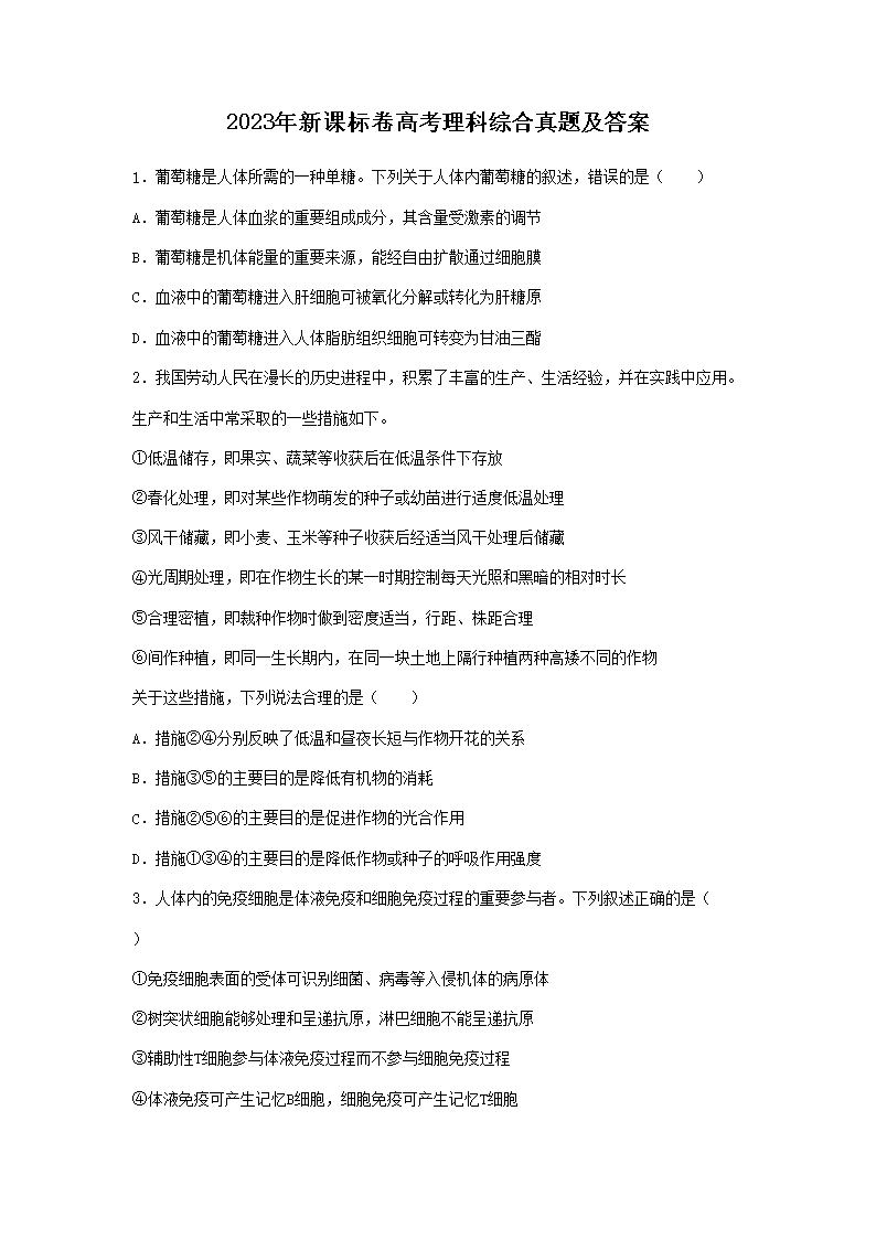 【文档预览】 文档大全网整理发布2023年新课标卷高考理科综合真题及答案(Word版),前五页预览如下: