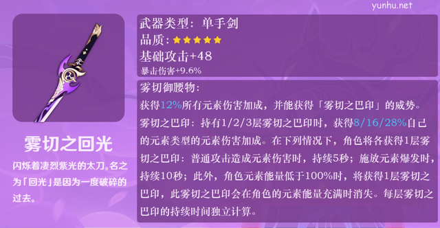 同时,特效词条引入了全新的加成方式,1精炼时就能直接获得12%的元素伤害加成,并且可以获得【雾切之ba巴印】的BUFF提升,这个BUFF最多可以提供28%自己元素类型的元素伤害加成,也就是说1精炼的武器就能拥有40%的元素伤害加成,有可能是刻晴的专属武器。