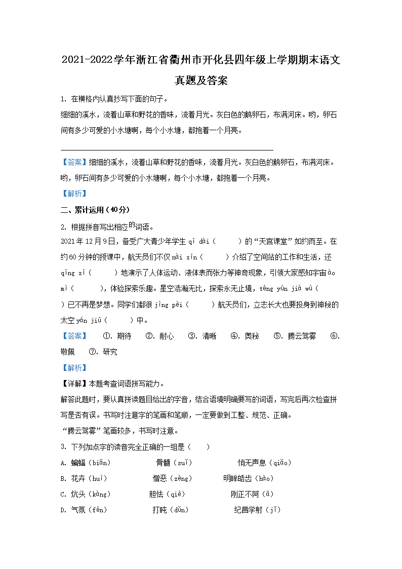 2021-2022学年浙江省衢州市开化县四年级上学期期末语文真题及答案(Word版)09-29