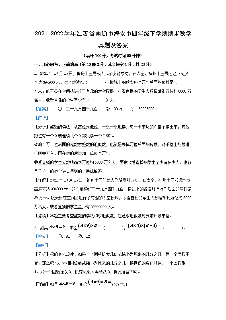 2021-2022学年江苏省南通市海安市四年级下学期期末数学真题及答案(Word版)07-15