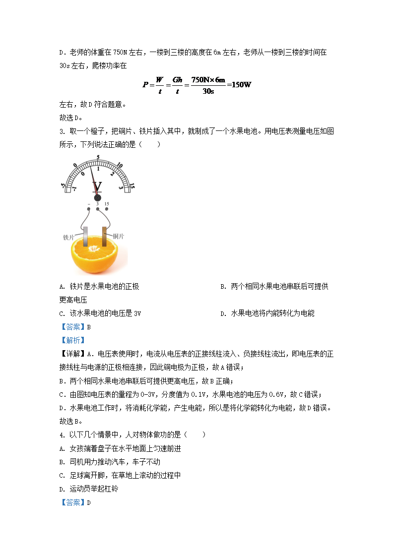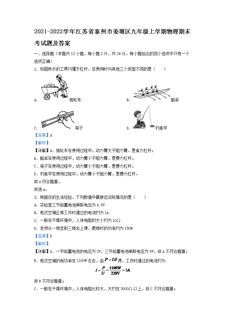 2021-2022学年江苏省泰州市姜堰区九年级上学期物理期末考试题及答案(Word版)10-10