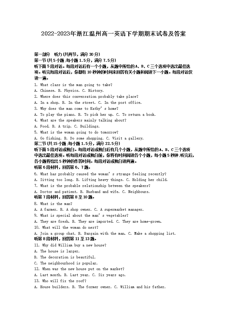 2022-2023年浙江温州高一英语下学期期末试卷及答案(Word版)10-21