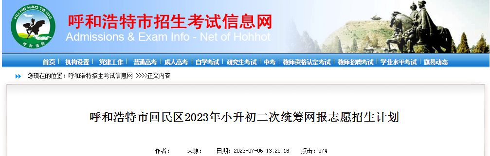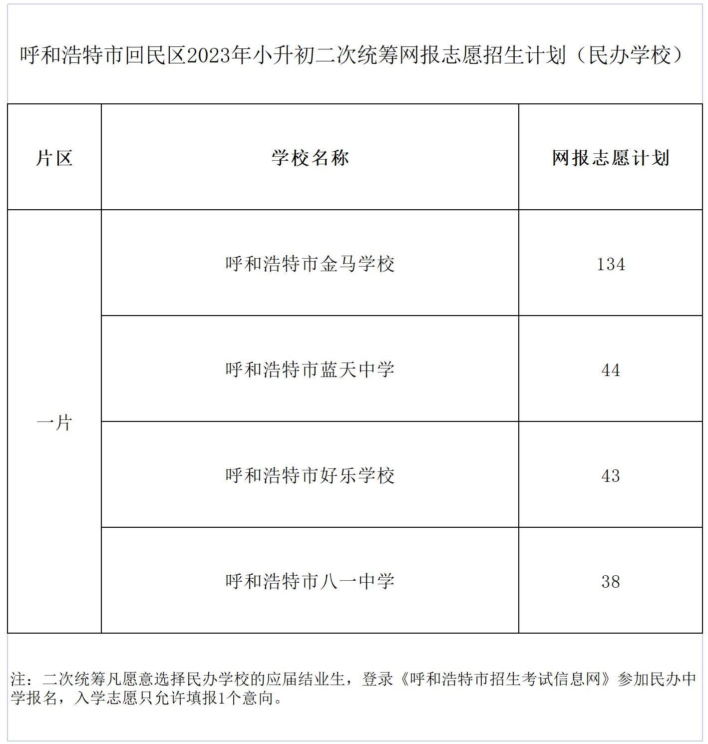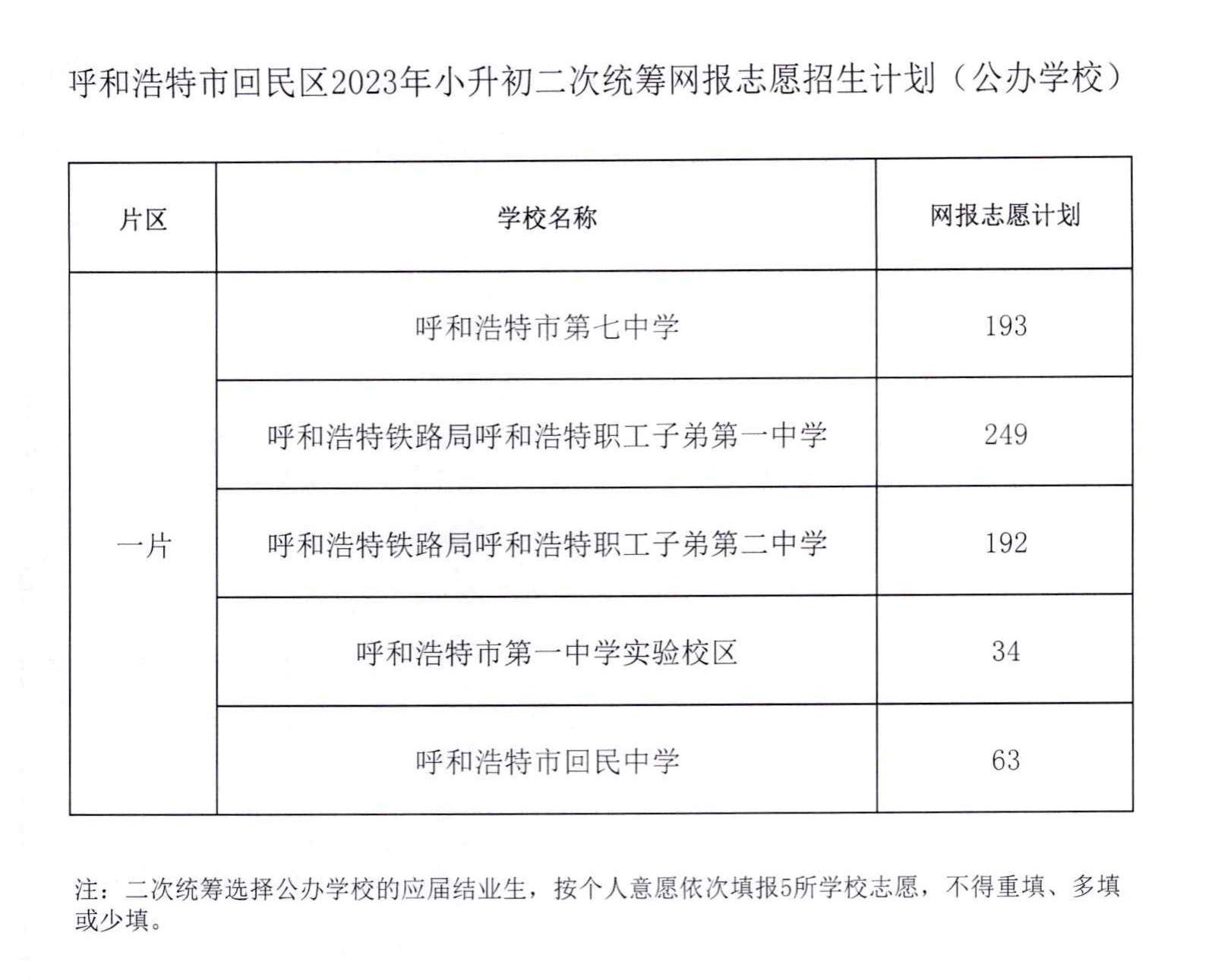 内蒙古呼和浩特市回民区2023年小升初二次统筹网报志愿招生计划公布07-08