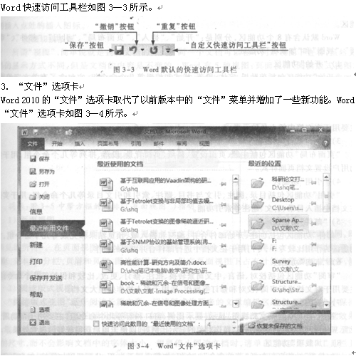 Word默认的快速访问工具栏包含保存、撤销、重复和自定义快速访问工具栏命令按钮,Word快速访问工具栏如图3—3所示。