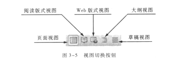所谓“视图”,简单说就是查看文档的方式。同一个文档可以在不同的视图下查看,虽然文档的显示方式不同,但是文档的内容是不变的。Word有5种视图:页面视图、阅读版式视图、Web版式视图、大纲视图和草稿视图,用户可以根据对文档的操作需求不同使用不同的视图。视图之间的切换可以使用“视图”功能区中的命令,但更简洁的方法是使用水平滚动条左端的视图切换按钿,如图3—5所示。