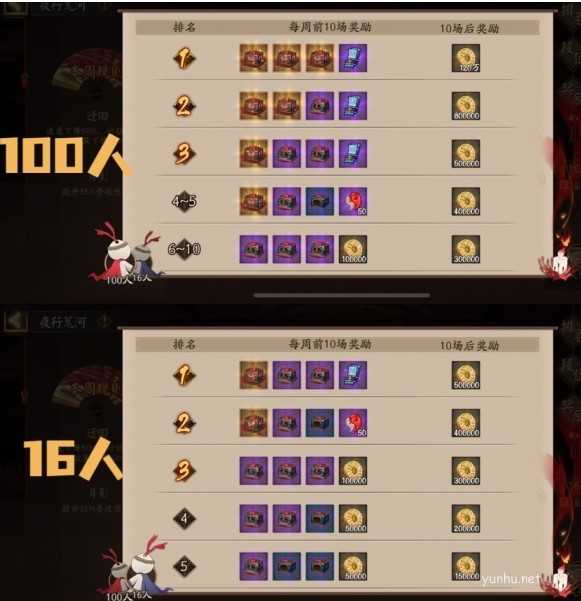 夜行荒河分16人模式和100人模式,100人模式仅在每日的13:00~15:00和21:00~23:00开放。100人模式开放期间,16人模式关闭。仅100人模式下可以获得段位的积分。