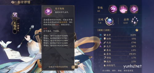 技能描述:夏婉莲诗作惊才绝艳,对敌方单体造成攻击力140%的怒攻伤害,50%的概率使目标眩晕2回合。