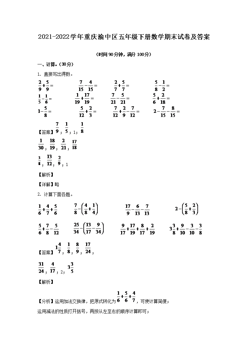 【文档预览】 文档大全网整理发布2021-2022学年重庆渝中区五年级下册数学期末试卷及答案(Word版),前五页预览如下: