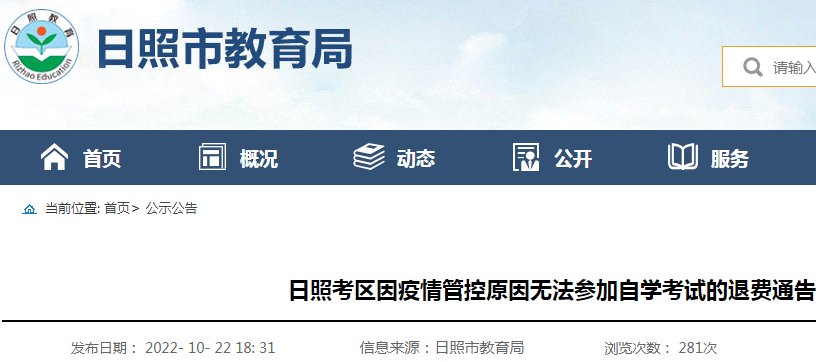 山东日照考区因疫情管控原因无法参加2022年10月自学考试的退费通告10-25