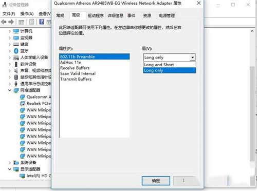 三、打开无线网络属性之后,切换到“高级选项”,然后点击左侧的 802.1 相关选项,然后将右侧默认的“Long and Short”改为“Long only”,之后点击底部的“确定保存”。
