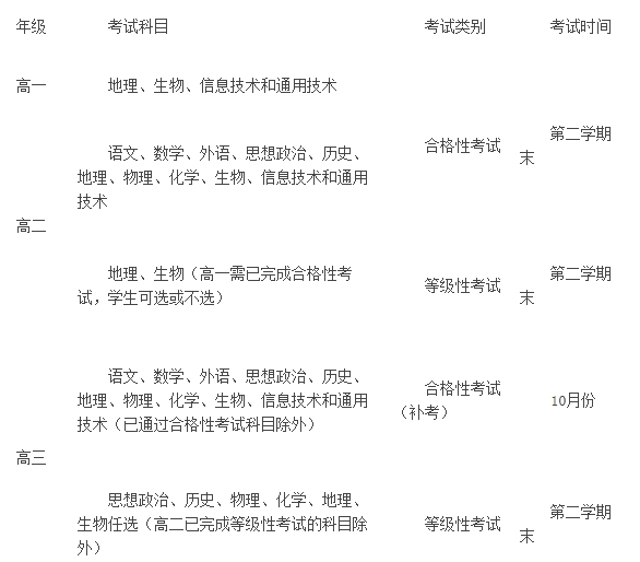 学业水平考试实施第二年开齐合格性考试各科目的考试,第三年开齐等级性考试各科目的考试。实施第三年始学业水平考试的合格性考试、等级性考试及合格性考试的补考每年常态化各安排一次,不同年级的学生根据需要选择参加。