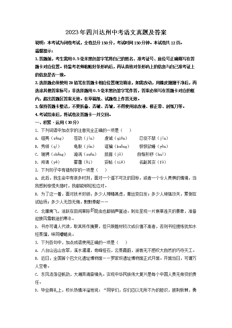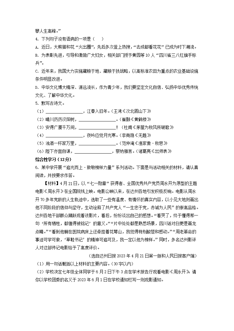 2023年四川达州中考语文真题及答案(Word版)06-16