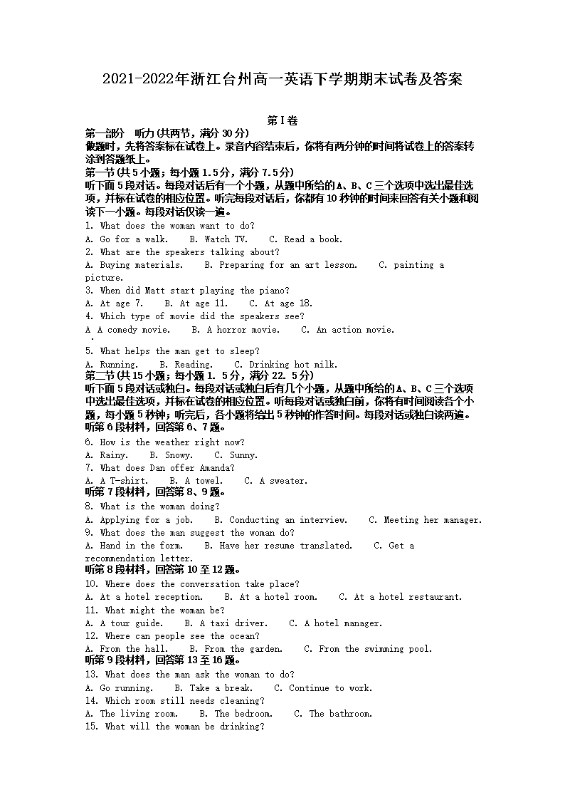 【文档预览】 文档大全网整理发布2021-2022年浙江台州高一英语下学期期末试卷及答案(Word版),前五页预览如下: