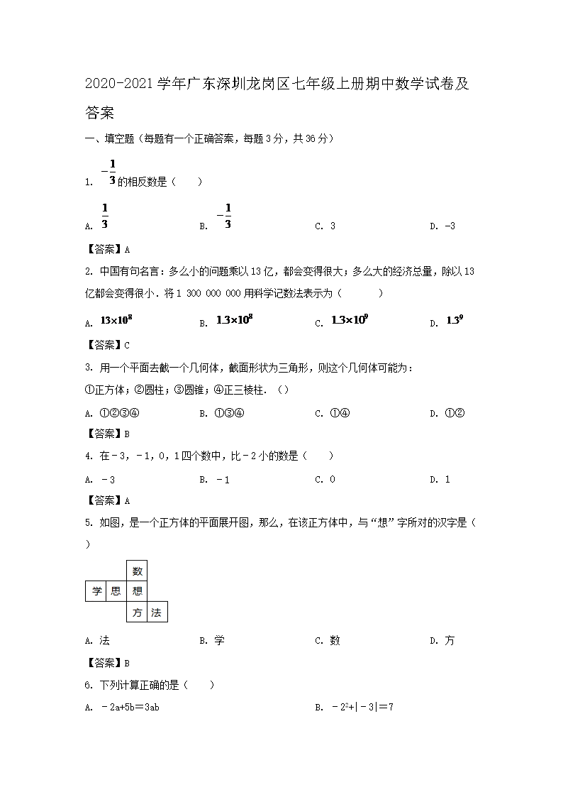 2020-2021学年广东深圳龙岗区七年级上册期中数学试卷及答案(Word版)09-22