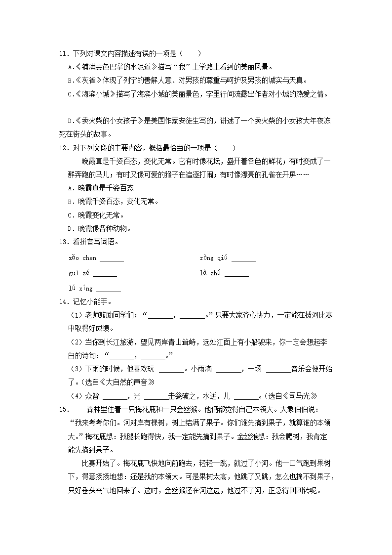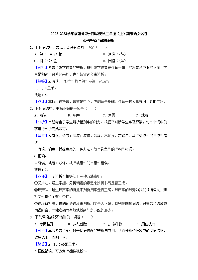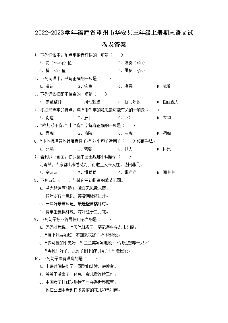 【文档预览】 文档大全网整理发布2022-2023学年福建省漳州市华安县三年级上册期末语文试卷及答案(Word版),前五页预览如下: