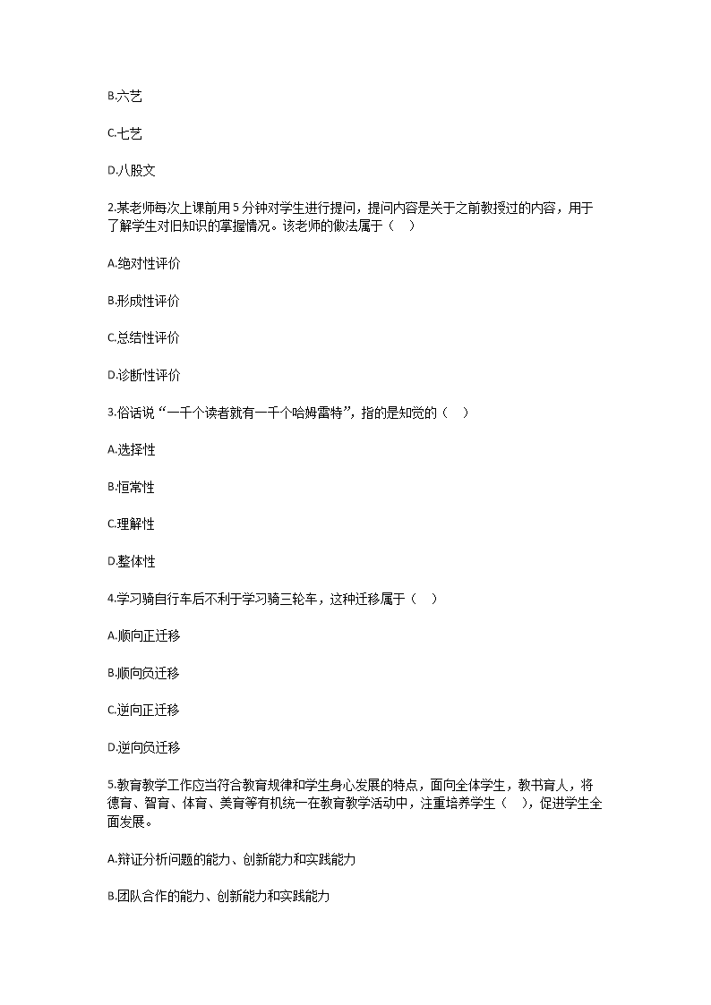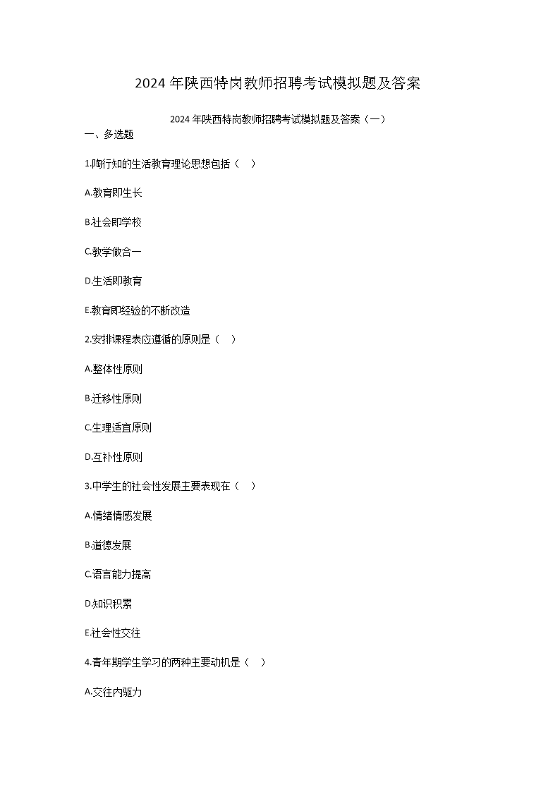 【文档预览】 文档大全网整理发布2024年陕西特岗教师招聘考试模拟题及答案(Word版),前五页预览如下: