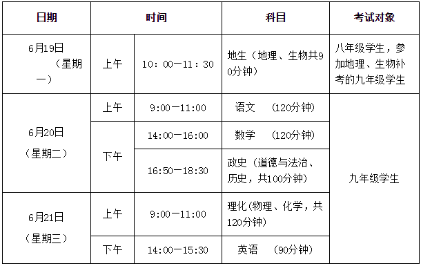 2023年初中毕业生(现九年级学生)生物、地理、信息技术、生命安全教育、心理健康教育已在八年级第二学期组织考试;理化生实验操作考试,安排在九年级第二学期5月份进行;体育与健康现场测试安排在5月份进行(其中男生1000米跑、女生800米跑不组织现场测试,均以满分15分计入体育中考成绩);受疫情影响,音乐、美术科目考试安排在九年级第二学期3-4月份进行;英语听力口语考试安排在4月18-19日进行。