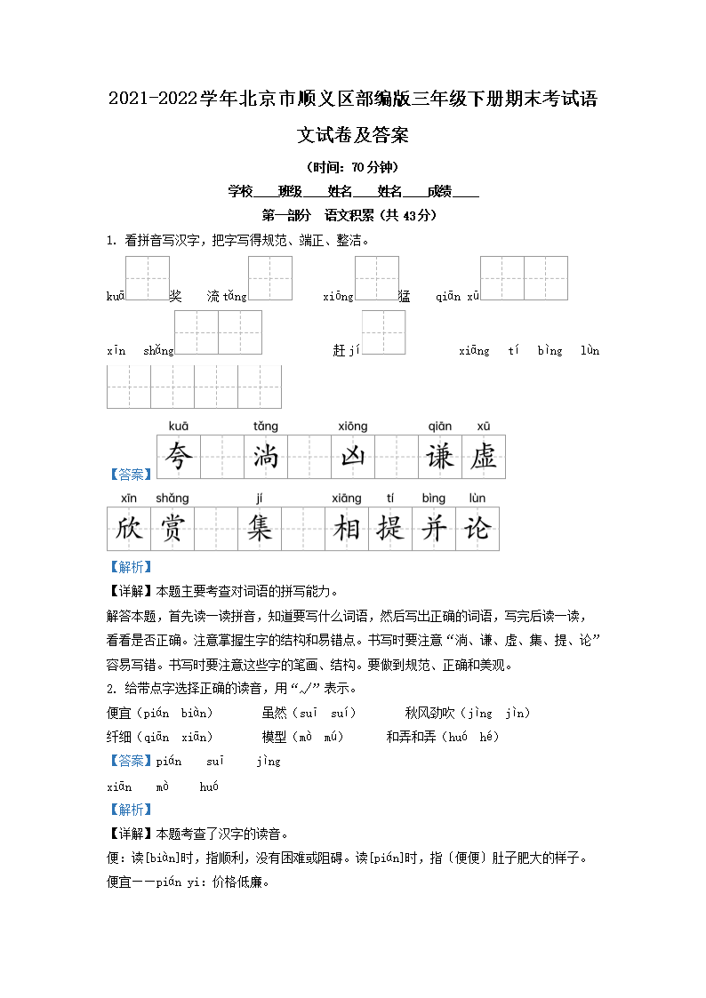 【文档预览】 文档大全网整理发布2021-2022学年北京市顺义区部编版三年级下册期末考试语文试卷及答案(Word版),前五页预览如下: